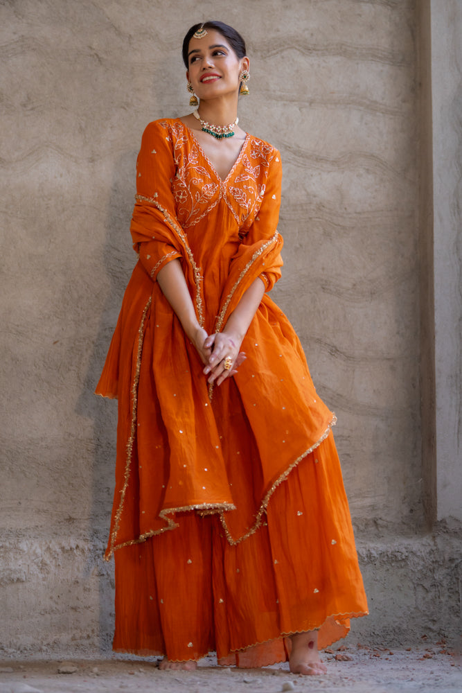This Three-Piece Set Includes an Kurta, Sharara, and a Dupatta. The Kurta Features Heavy Pitta work Detailing, Paired With Straight Pants and an Organza Dupatta Adorned With Delicate Pitta Work.