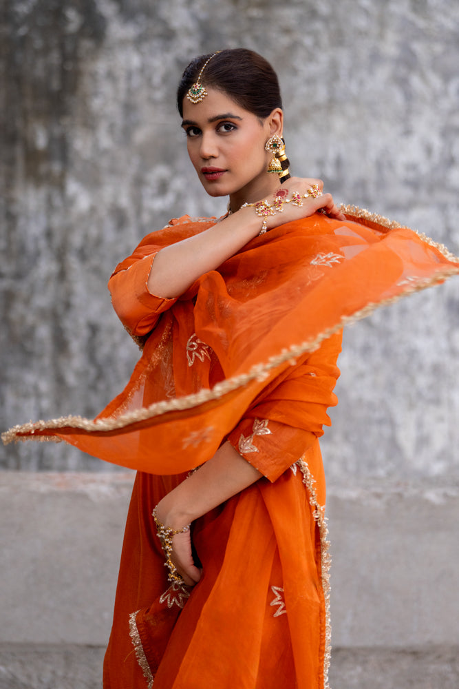 The Kurta Features Heavy Marori Work Detailing, Paired With Straight Pants and an Organza Dupatta Adorned With Delicate Pitta Work.