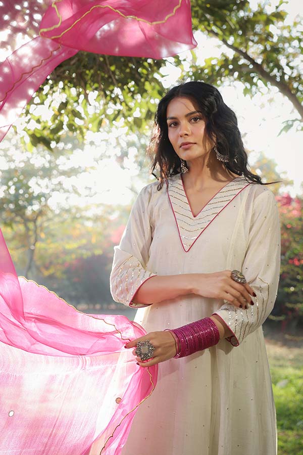 This four-piece set includes kurta, pant, slip (inner) and a dupatta. The handcrafted sequinn work pearl white kurta comes alongwith gotta work neon green pant and pink organza dupatta.