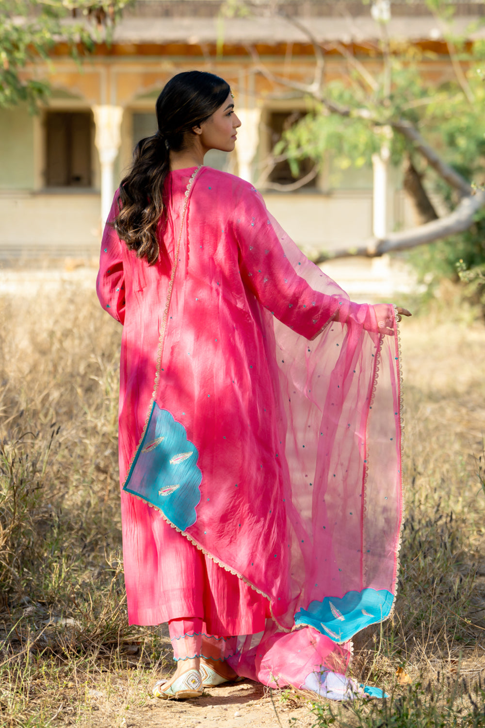 The Anarkali Kurta Features Aari work Detailing, Paired With Straight Pants and a Chanderi Dupatta Adorned With Delicate Pitta Work. (Cotton Inner Slip/Inlet Included)