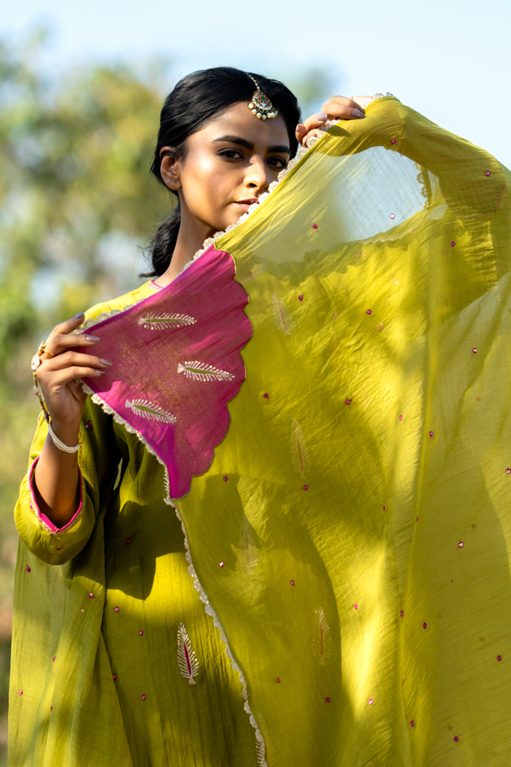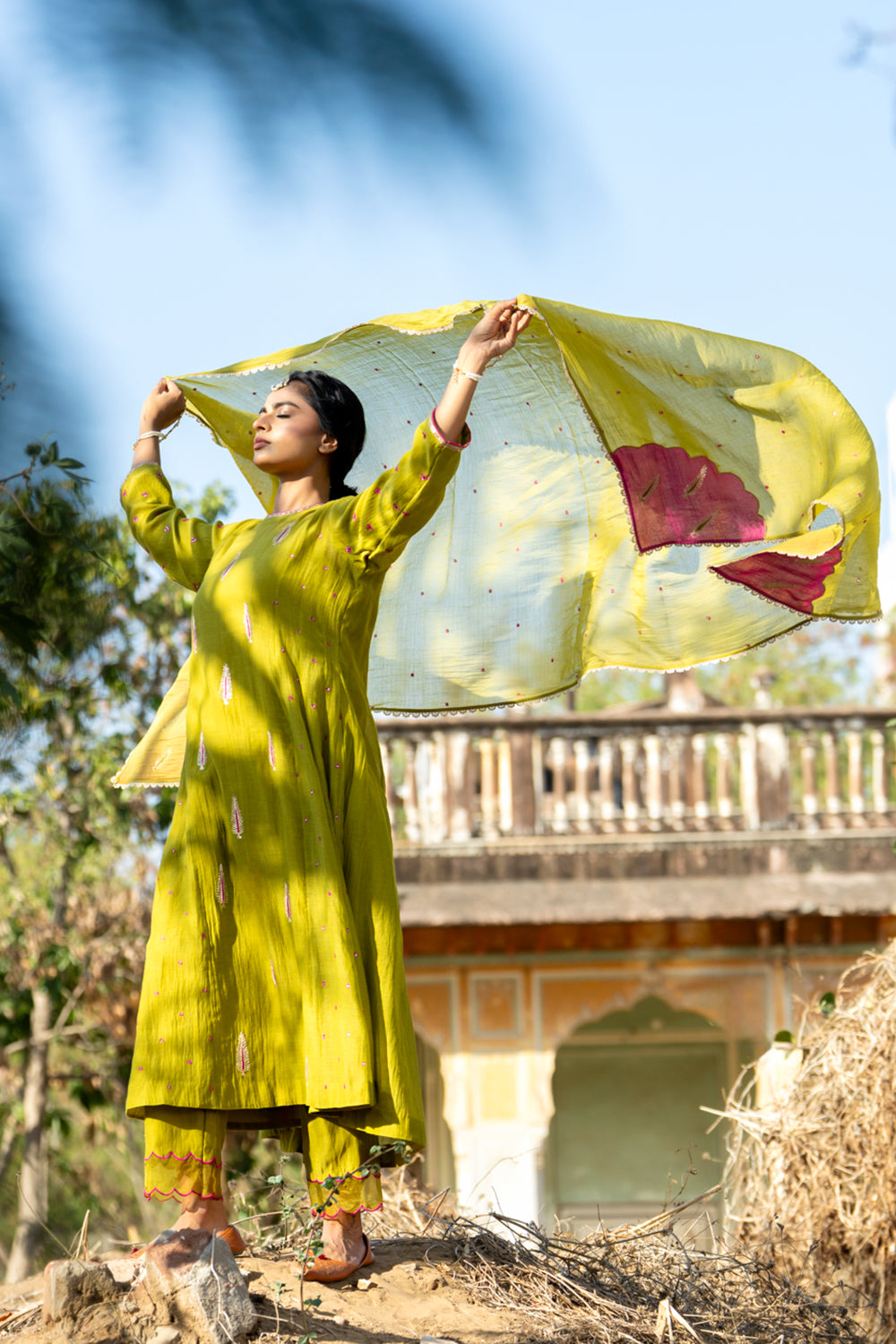 The Anarkali Kurta Features Aari work Detailing, Paired With Straight Pants and a Chanderi Dupatta Adorned With Delicate Pitta Work. (Cotton Inner Slip/Inlet Included)